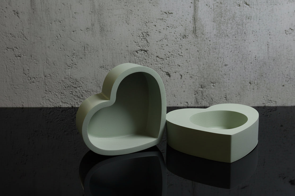 - Two-piece heart-shaped design with base and vessel