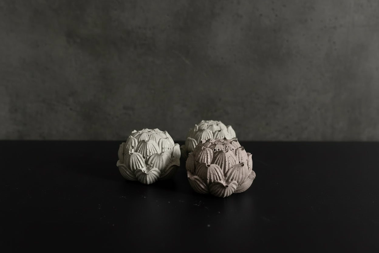 This sculpted incense holder is shaped like a layered flower, each petal softly curved and textured to catch the light. The raw, cement finish gives it an earthy, grounded feel while the delicate form adds a quiet elegance to any space.