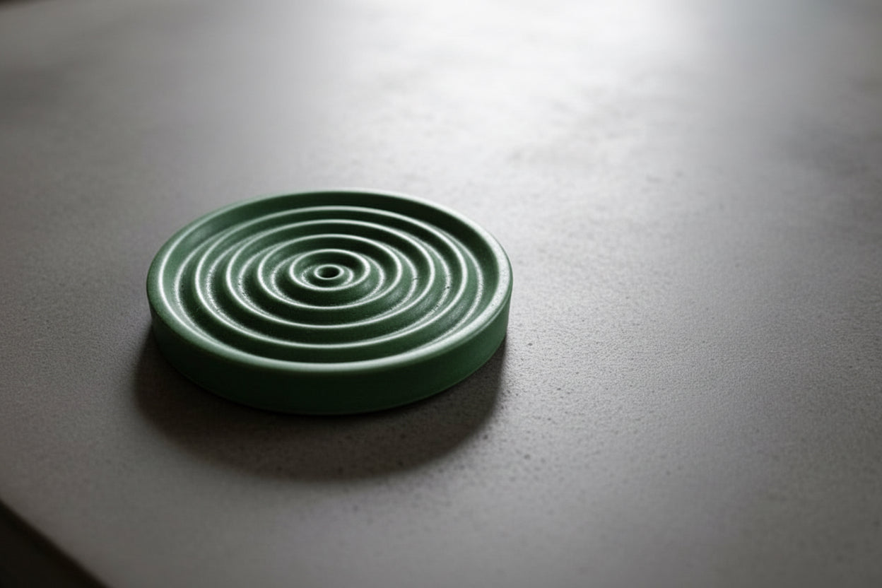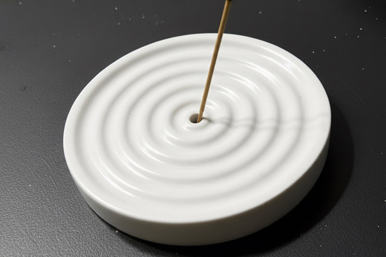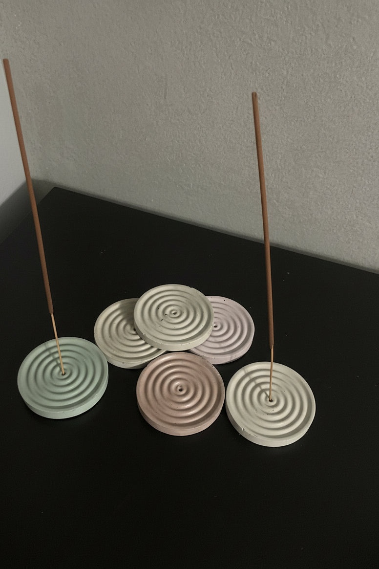 A sculptural incense holder defined by soft concentric ridges that draw the eye inward, inviting stillness. Hand-cast with subtle texture and natural variation, each piece carries the marks of the making—no two are exactly alike. Designed to cradle a single incense stick, allowing ash to fall gently into its form, creating a moment of calm in motion. Minimal yet soulful, it brings ritual, warmth, and quiet presence to any space.